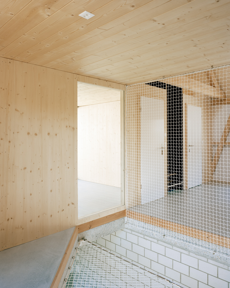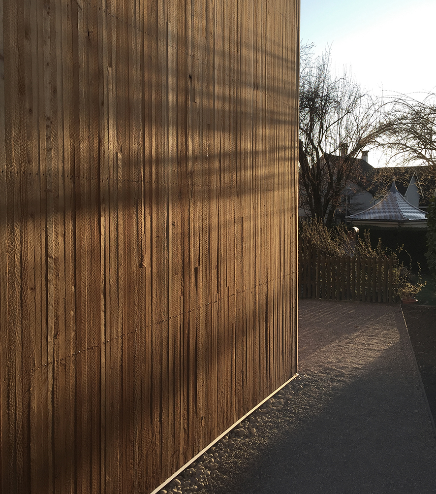 Die Holzfassade aus heimischer Lärche wird die Witterung auf den Kanthölzern und den Holzfenstern aus Föhre über die Jahre hin zeichnen. Gemäß dem Ortsbildschutz nimmt der zurückhaltende Bau Bezug zum historischen Kontext auf und prägt den Ort nachhaltig.