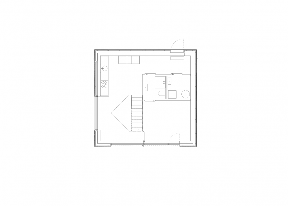 Auf dem quadratischen Grundriss steht heute ein kleines Haus mit 99 m2 Wohnfläche. Die Öffnungen im Innern verknüpfen die Räume und schaffen gegen außen bestimmte Bezüge. Durchblicke entstehen.