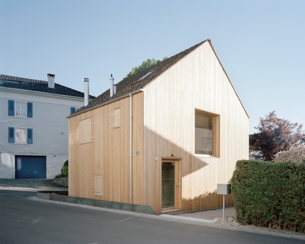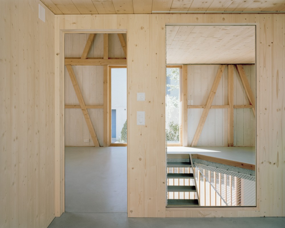 Mitten in Jonschwil wurden in einer Remise übereinander drei, zueinander abgedrehte, Zimmer eingebaut. Diese Stapelung öffnet einen spiralförmigen vertikalen Lebensraum durch alle drei Stockwerke hindurch.