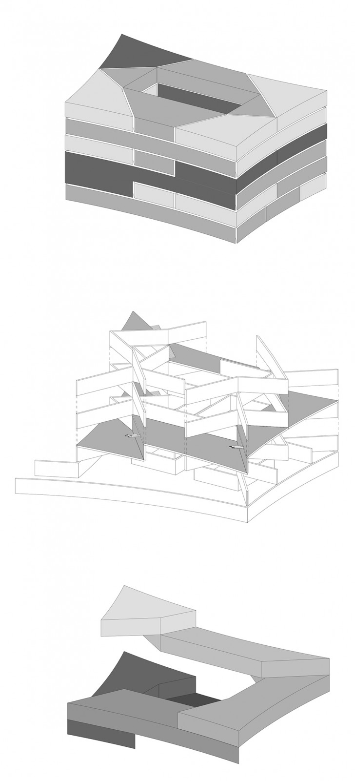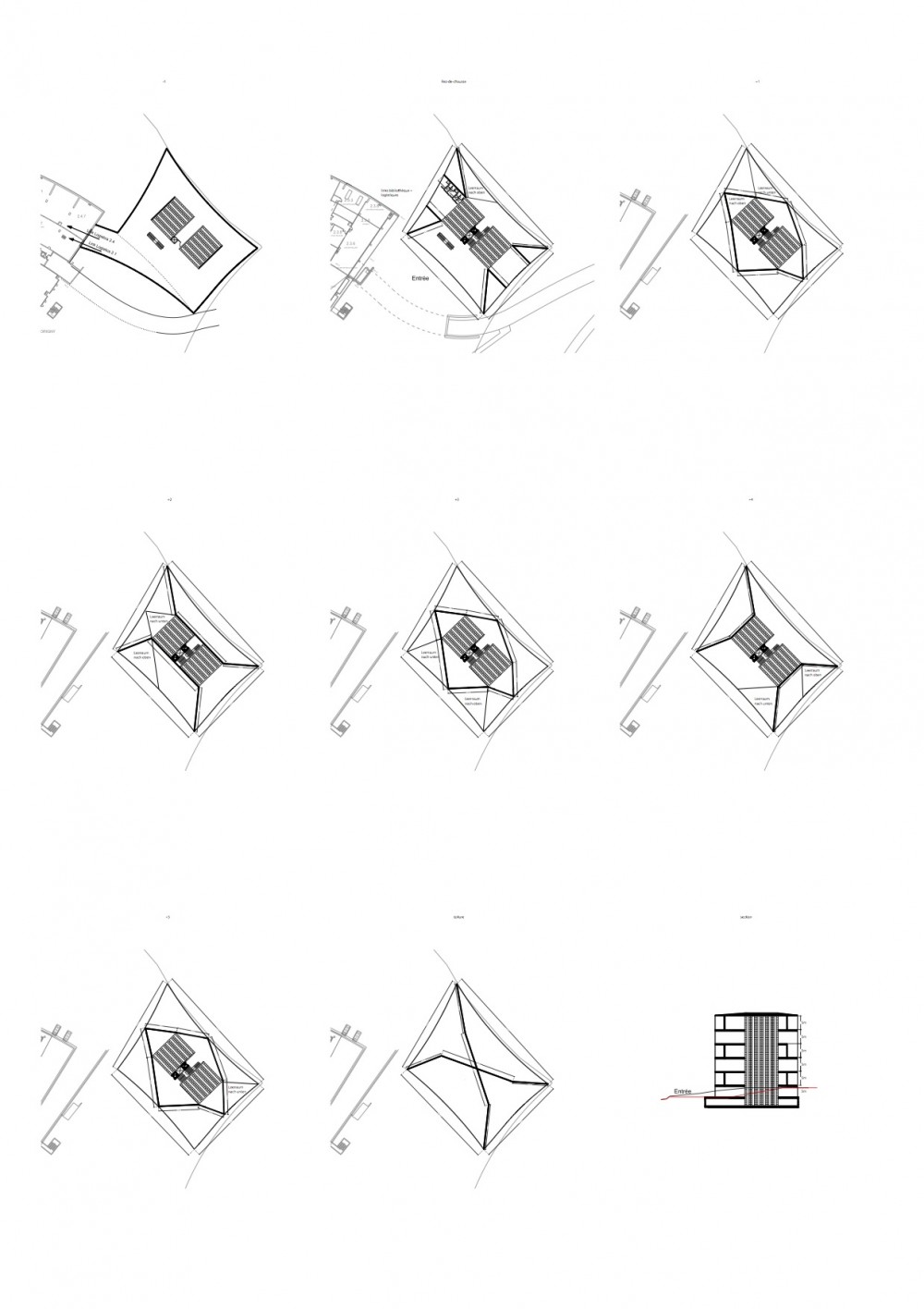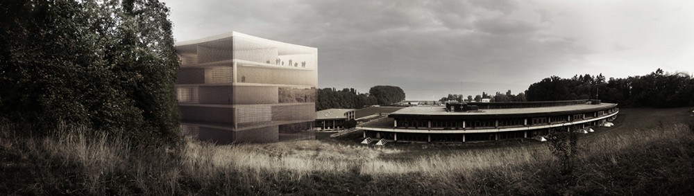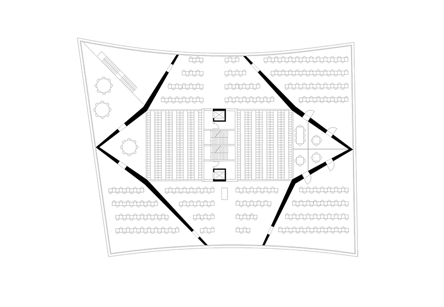 Nous proposons donc de faire une bibliothèque d'archive automatisé (Speicherbibliothek mit Hochregallager) qui peut être vue et qui en même temps cependant n’est pas prodigue avec le terrain ou totalement sous le sol. Au contraire, elle doit montrer la quantité de la connaissance et enrichir l'atmosphère principale dans la maison. Autour de cela on peut étudier. Un paysage éducatif, sur différents étages, dans une structure semblablement à des livres empilés.