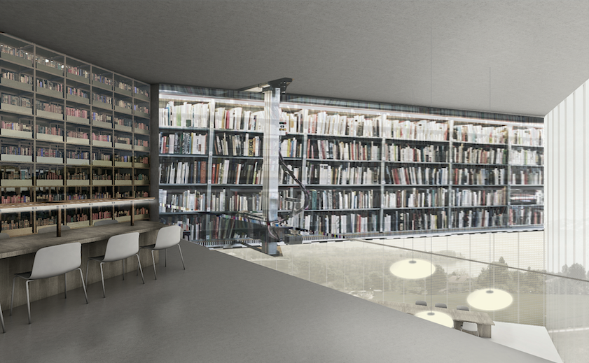Les avantages d’un système de stockage automatisé est le temps d’accès aux documents qui est énormément rapide, l'utilisation optimale de l'espace en tant que volume, la haute performance de manutention, l’accès direct à chaque article, le fonctionnement, la récupération et aussi stockage entièrement automatique. Un mouvement du savoir dynamique et cependant calme. Les livres et leur code RFID (Radio Fréquence Identification) forment donc ensemble la fondation de la bibliothèque. Ils sont structure physique et digitale de la bibliothèque et ils forment l’espace.