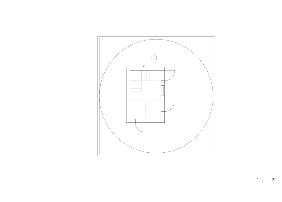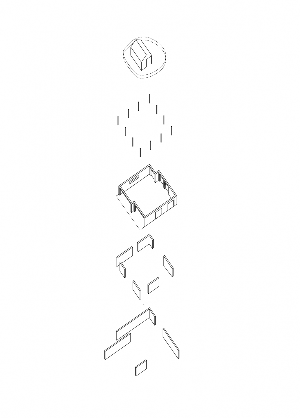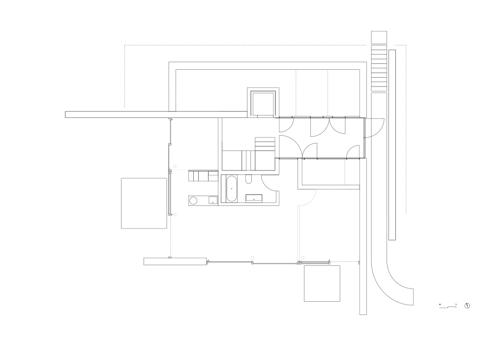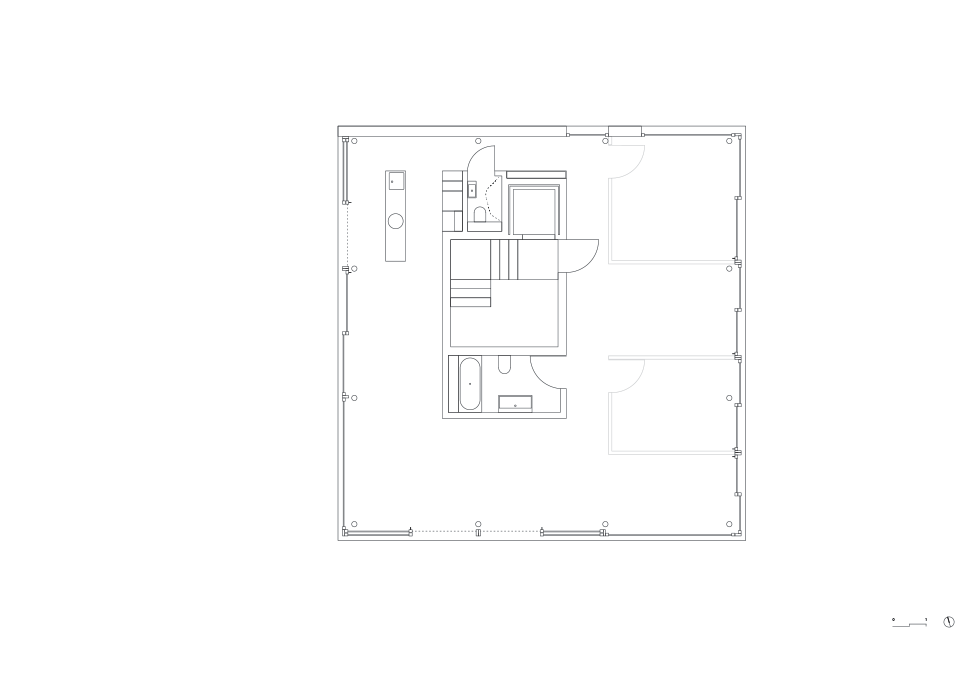 The fifth house is a small monolithic structure, akin to a „holiday cottage“, nestled on the roof. It houses a sauna serving all four families living in the house, and is a reference to the campers in the near camping site.