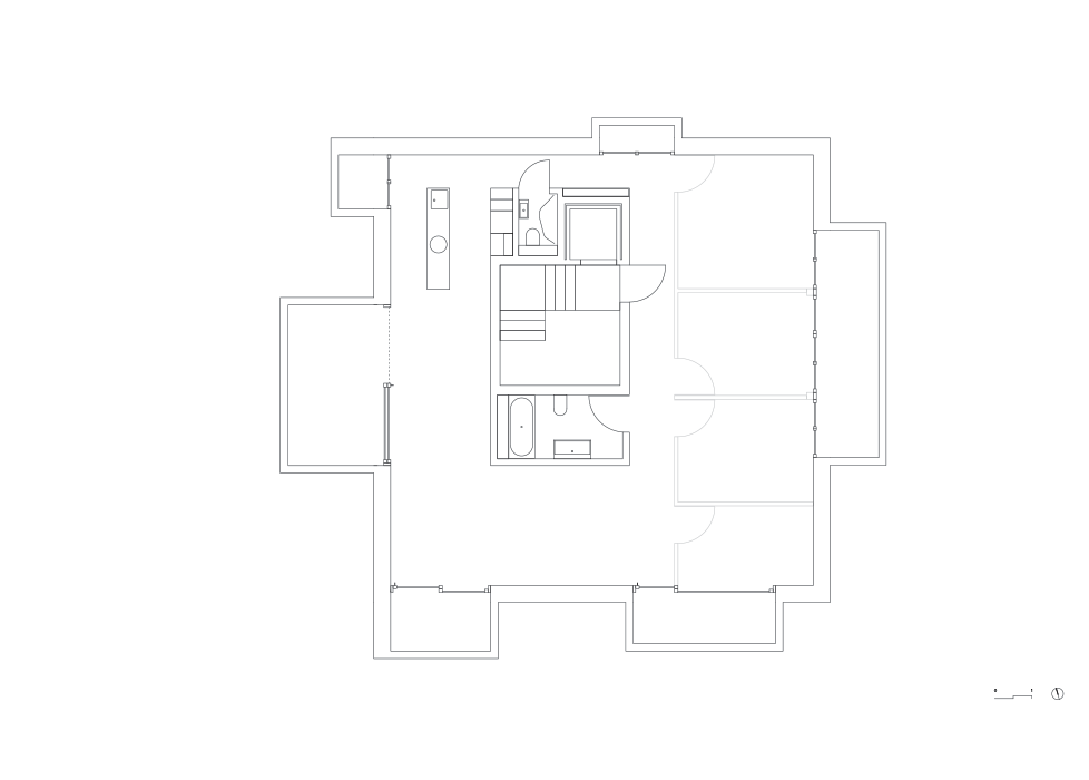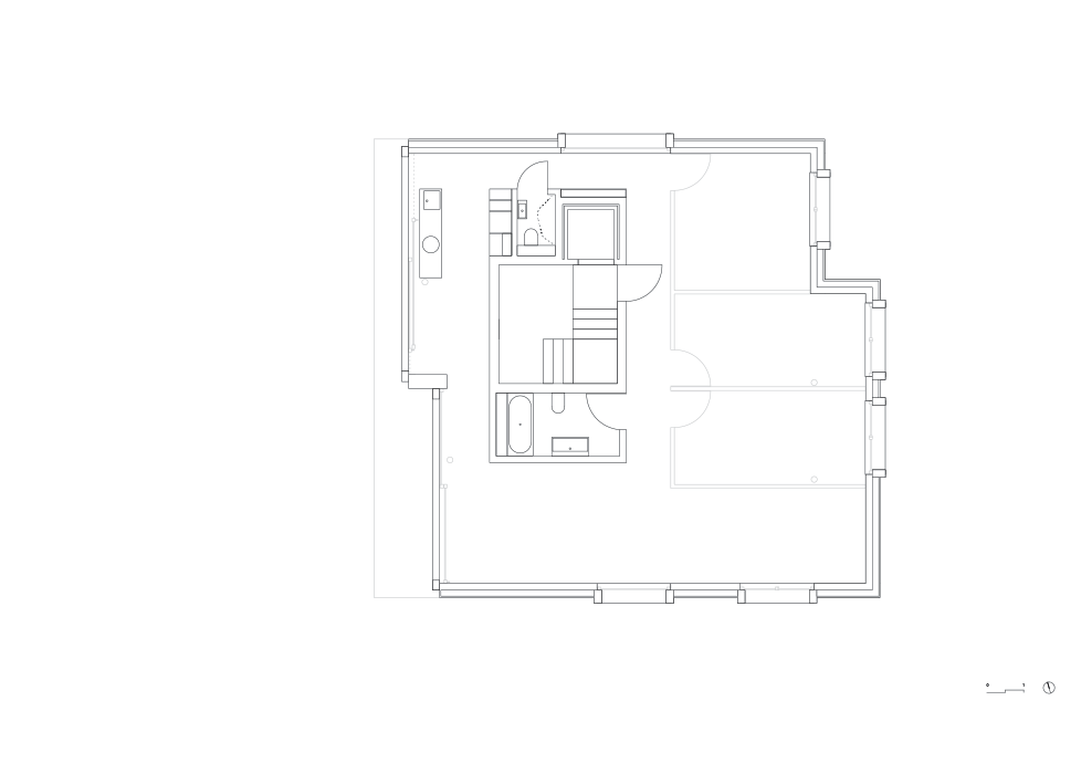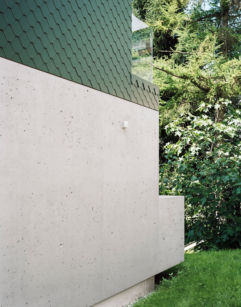 The second floor takes its inspiration from the „classic single house“. The house takes the shape of two shifted shoe-boxes and the shingle façade is a reference to the often very colourful and decorated exteriors of these houses. As the house cantilevers towards one side, it generates a loggia space, which is quite typical of this typology of housing. The kitchen also transforms itself into an outside space when opening the sliding doors towards the loggia, and the interiors are once again finished in a white plaster, to best absorb the surrounding green, while the facade, on the contrary, is of a hunting green colour, in an attempt to assimilate with the trees. The typical flower-windows, as they were conceived in the 50’s, frame the view and create at the same time pleasing niches in the inside.
