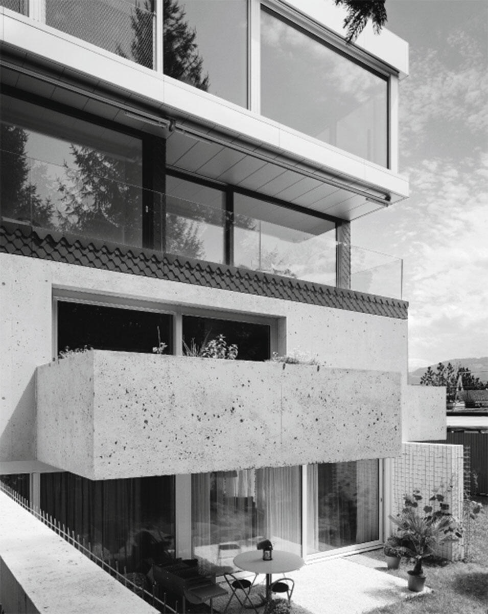 Fünf Häuser attempts to surpass this limitation. It applies the same position towards outside spaces, which is normally applied to single housing typologies but on a vertical setting. From a dense green setting at the base, the building then responds to a more urban context on the following level, then to a more semi-urban situation on the third floor, while the last floor interacts with the unveiling panorama of the surrounding mountains.