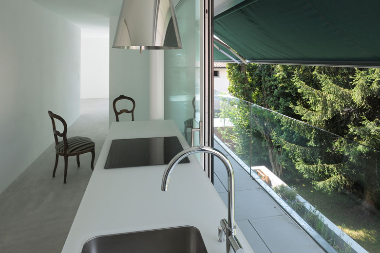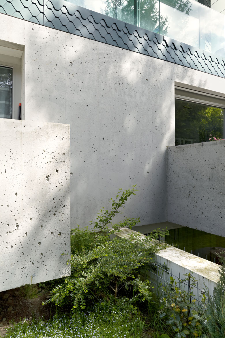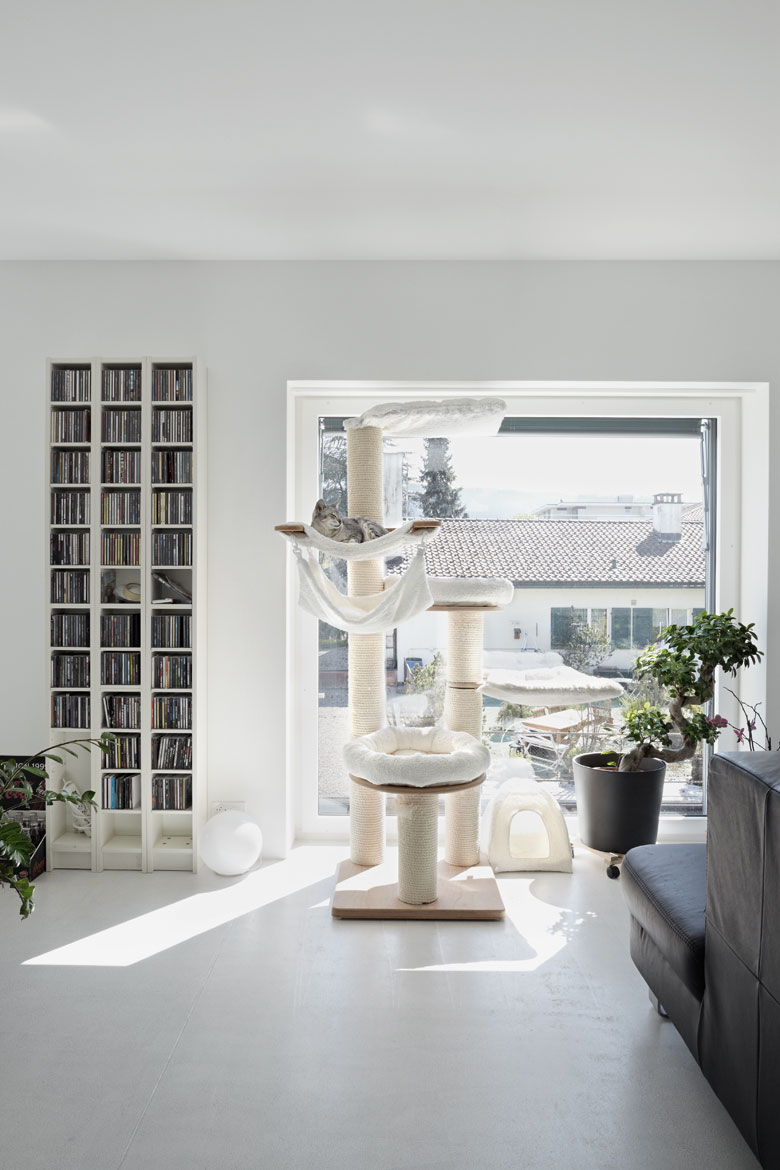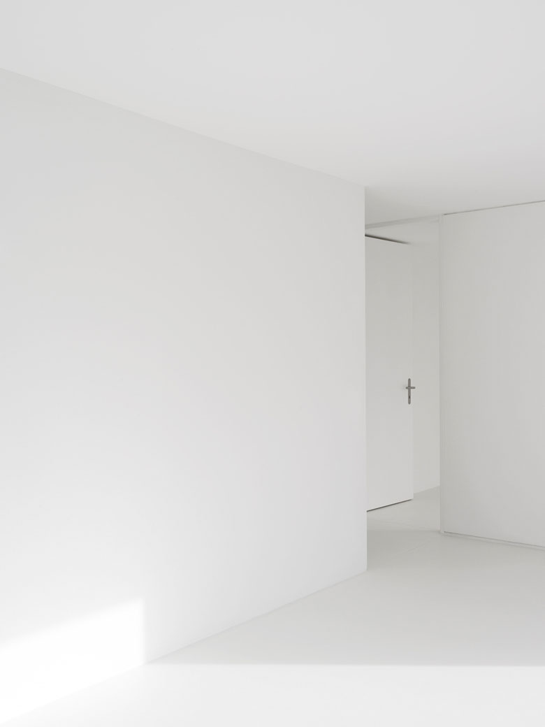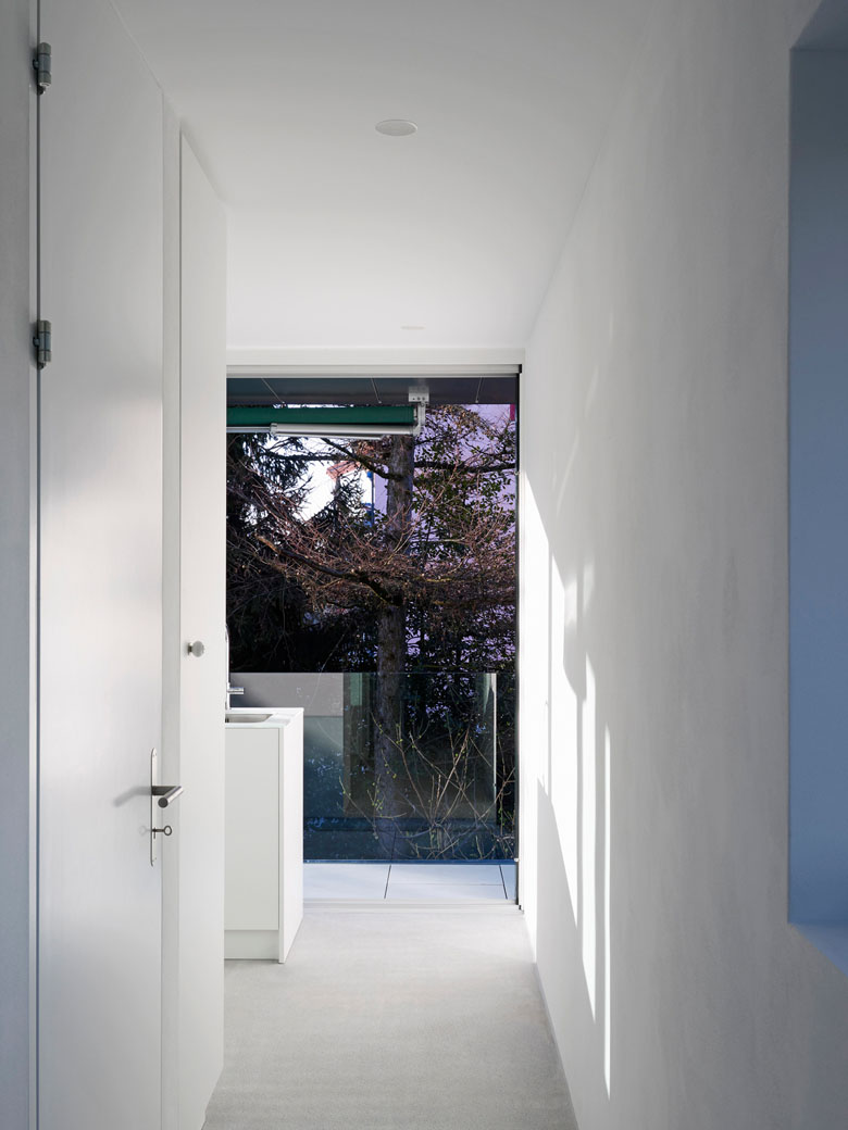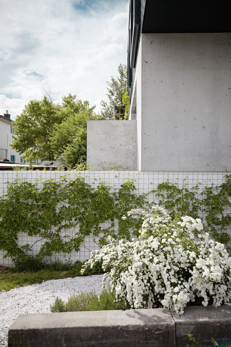 On the ground floor, the “garden villa” literally grows out of the green. The long walls, which extend from interior to exterior help in defining more intimate spaces within the garden. Covered with green plants through the help of metal fences, they reflect the change of seasons within the apartment’s interior spaces. The inside of the apartment is rendered in a whiter than white finish, which helps in absorbing the surrounding green and maximizing the interior spaces.