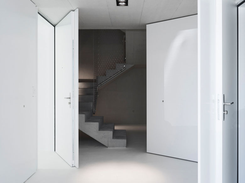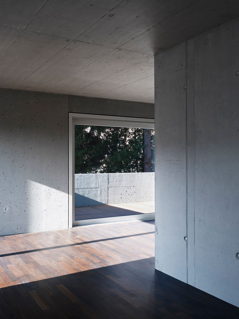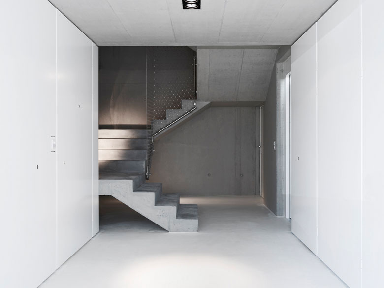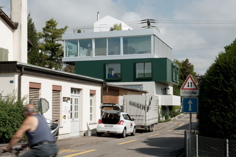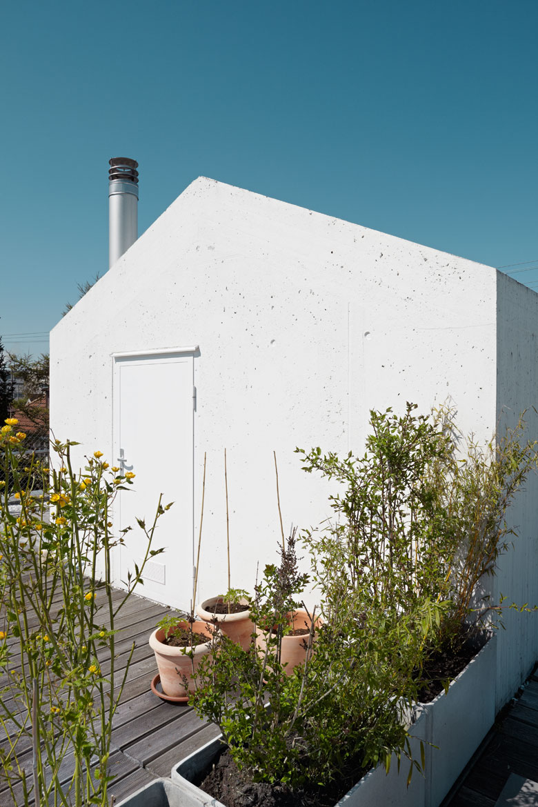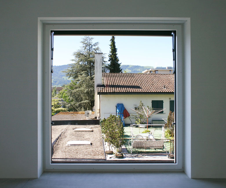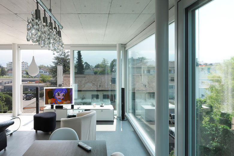On top of this classic single house, sits an austere glass and aluminium „pavilion“. With an open and clear view towards the Swiss mountainous panorama, its windows unveil the surrounding views in almost every direction. As it is situated at a certain height, the inside spaces are relatively sheltered from any direct views from the surrounding houses and the typology of this apartment tries to make the best advantage of the views offered at this height. The pavilion is positioned on top of the project in a near-accidental manner like one would place a box in a garden.