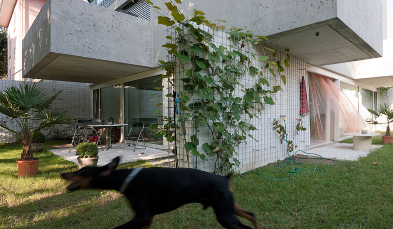 One floor up, the “high-rise apartment” shadows with its balconies parts of the “garden villa”. At this height, there are no interesting views nor can one access the garden. Inspired by a section of a typical high-rise social housing type, the concrete of the internal and external spaces frames the views while protecting the inside spaces from intrusive onlookers through the help of the concrete balustrades- in such a way that every opening in the facade is echoed with a balcony. The balconies, each with a specific function, entertain a dialogue with one another from the outside.