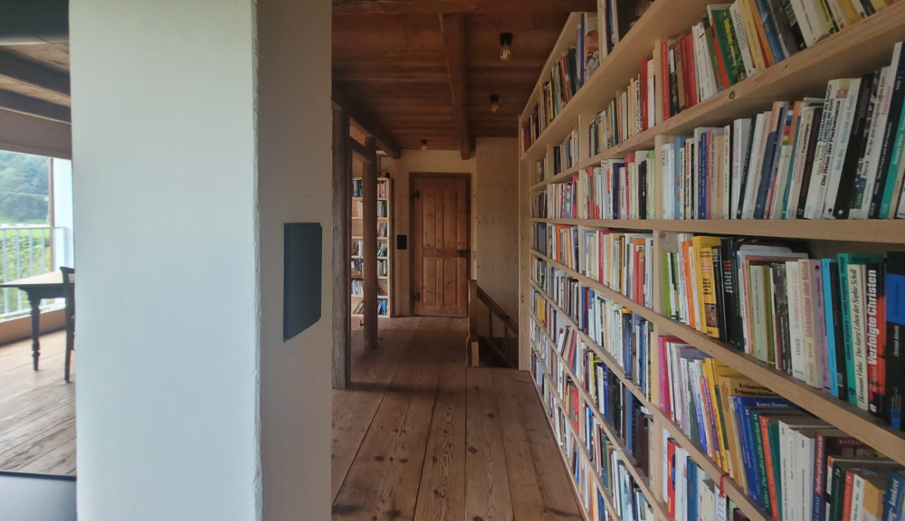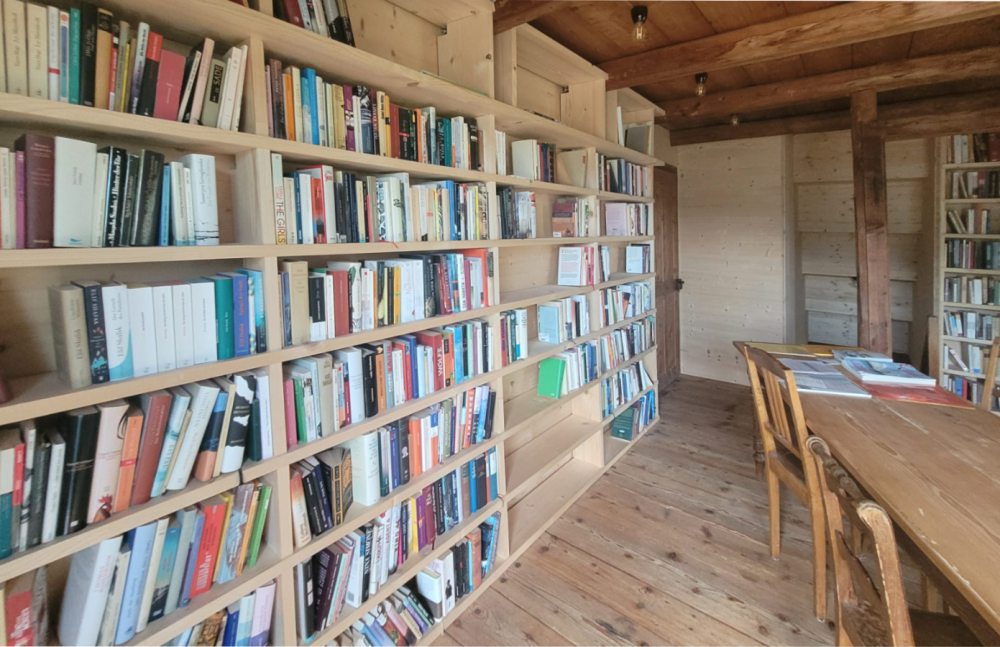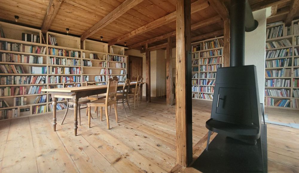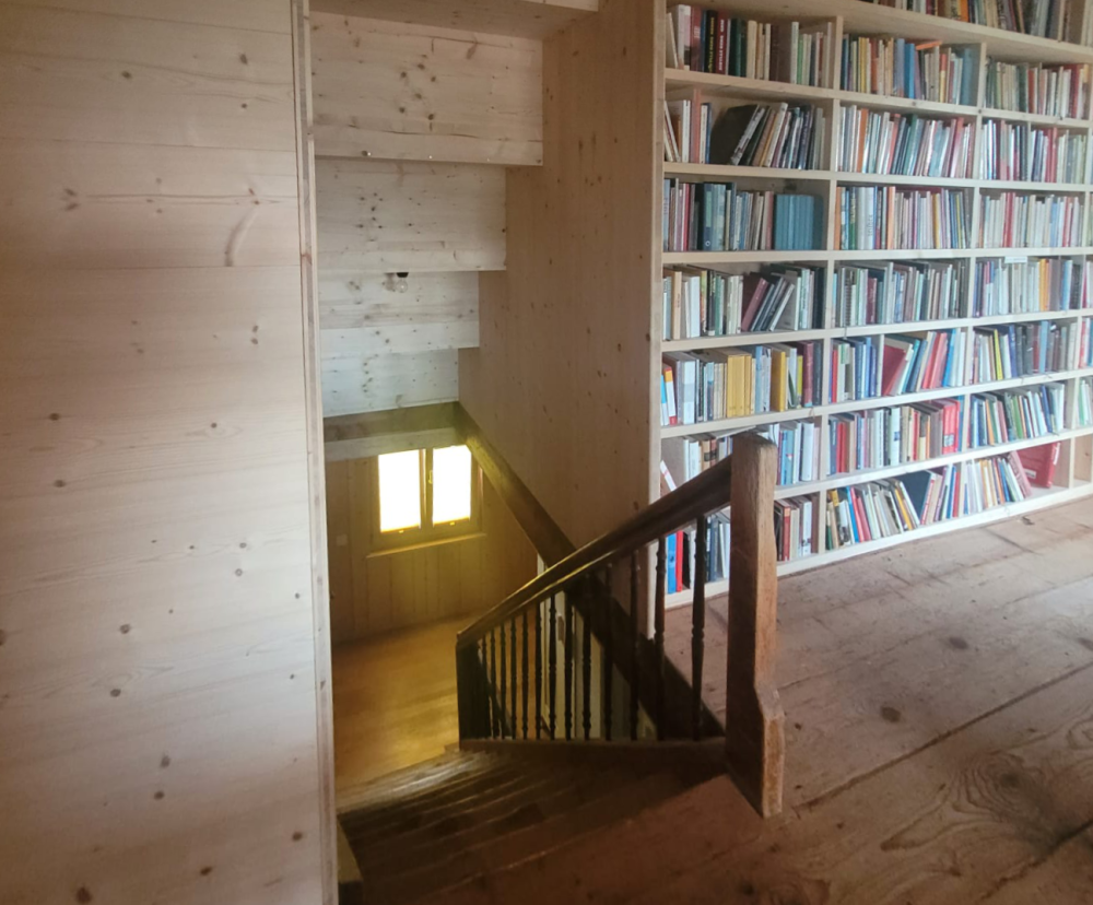 Das Haus der Bücher verfolgt eine einfache Konzeption. Überall wo die Sanierung des Hauses eine neue Wand mit sich brachte, wurde diese zur Bücherwand. Dies war relativ einfach hergeleitet da es im Bestand schon diverse Bücherwände gab. Die sehr alten Hölzer die im Dachstock ausgebaut wurden, wurden ein Stockwerk weiter unten als Bodenmaterial verwendet.